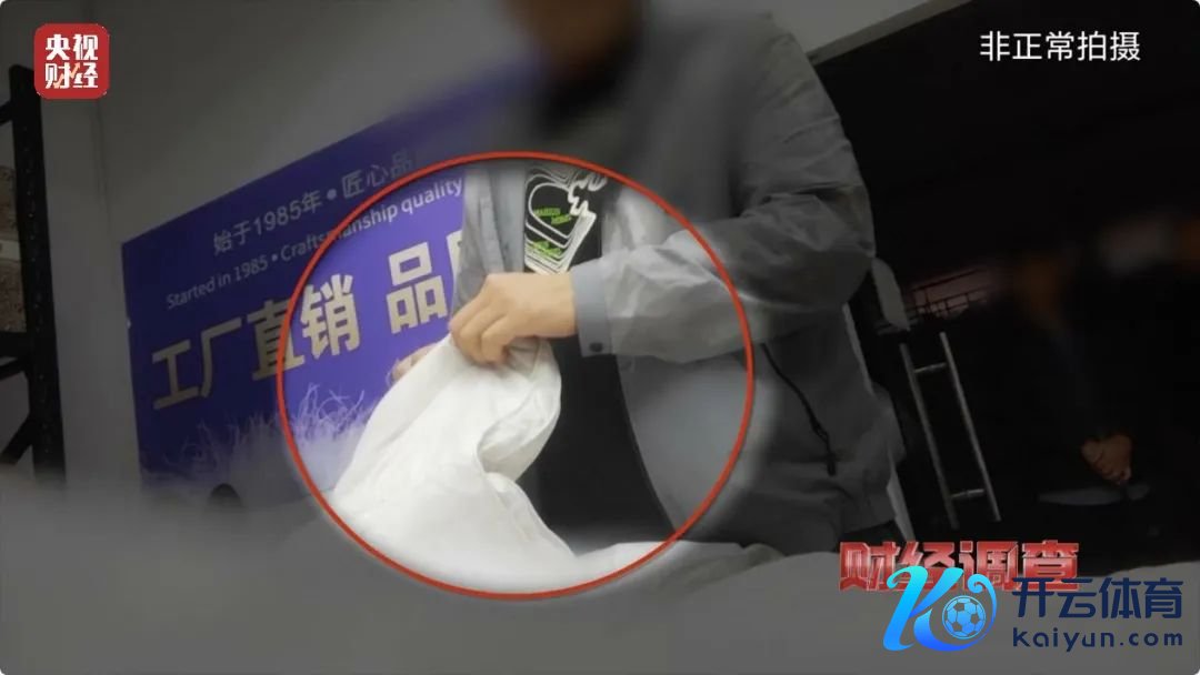 《财经观看》记者来到南通市南海路的盟庭家居,参加羽绒被的坐褥时势,责任主说念主员向记者自大,他们坐褥的是填充“飞丝”的假羽绒被。