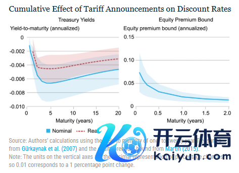盘问东说念主员还暗意,股市价钱着落可能反馈出两种力量。开头,商场可能对改日公司利润变得愈加悲不雅;其次,即使改日利润的预期旅途保执不变,商场参与者执有风险财富的意愿也可能缩短。盘问发现,这些关税公告如实刺激了投资者逃向避险财富,使好意思债收益率下降(五年期好意思债影响最大),股权溢价(股票收益率与无风险财富收益率之差)高潮。