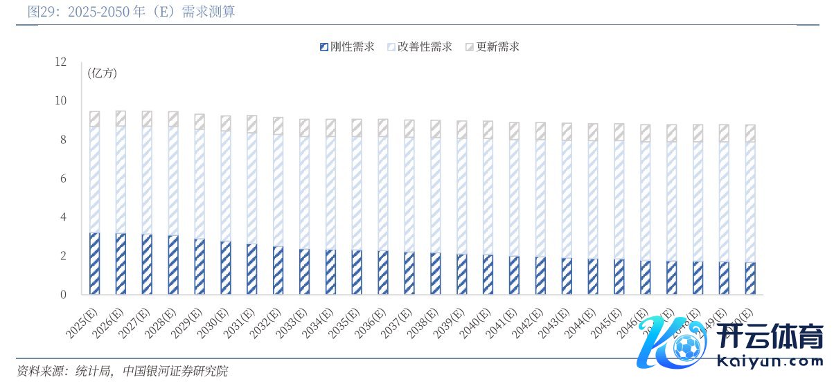 据中国星河(601881)证券测算,瞻望2050年,房地产行业的总需求将达到8.75亿方以上,其中,刚性需求、改善性需求、更新需求离别为1.689亿方、6.185亿方、0.878亿方,离别占总需求的19.30%、70.67%、10.03%。跟着东说念主口增长乏力、城镇化率栽种速度变缓,改善性需求或成为总需求的架海金梁。
