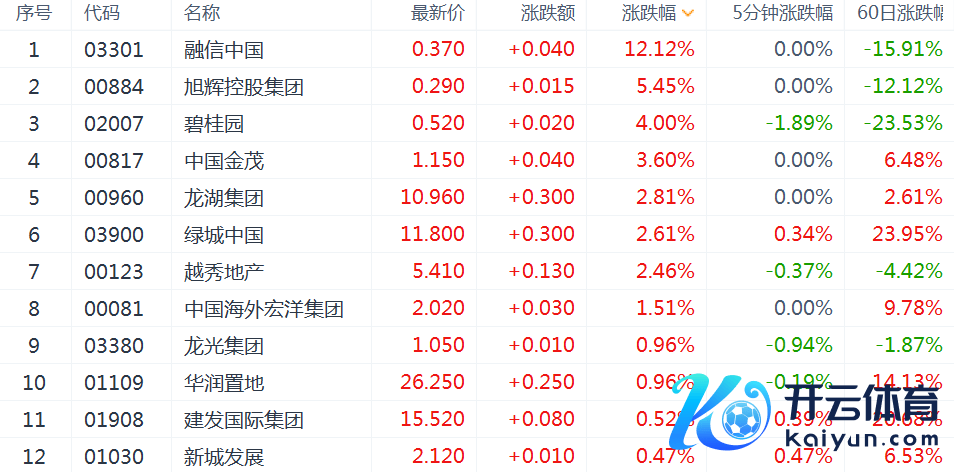 3月3日,港股地产板块异动清晰,涨幅引东说念主谨防。从盘面上来看,早盘时代,内房股板块强势拉升,涨幅一度涨超4%,率先稠密板块,此后该板块涨幅收窄至2%傍边,截止收盘,该板块收涨至0.68%。个股中,融信中国(03301)大涨超12%,旭辉控股(00884)涨超5%,碧桂园(02007)则涨逾4%。