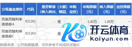 本站音书,9月24日百嘉基金管制有限公司发布《百嘉百臻利率债债券型证券投资基金暂停大额申购及大额颐养转入业务的公告》。公告中指示,为了基金的安详运作,保护基金份额捏有东说念主利益欧洲杯体育,自2025年9月24日起百嘉百臻利率债债券型证券投资基金暂停大额申购及大额颐养转入业务,申购、颐养转入上限金额为1.0万元,下属分级基金颐养明细如下: